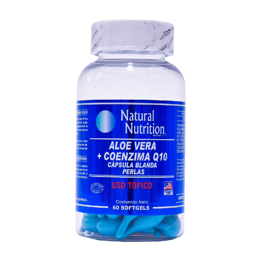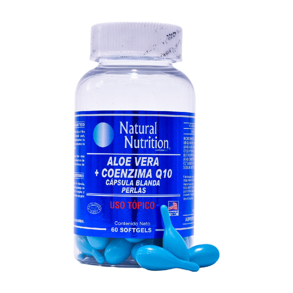 El Aloe Vera + Coenzima Q10 Natural Nutrition es un tratamiento cosmético en perlas de uso tópico diseñado para hidratar, suavizar y mejorar la apariencia general de la piel del rostro. Su fórmula combina aloe vera, reconocido por su acción humectante y refrescante, con coenzima Q10, un antioxidante que contribuye a mantener una apariencia luminosa y revitalizada.