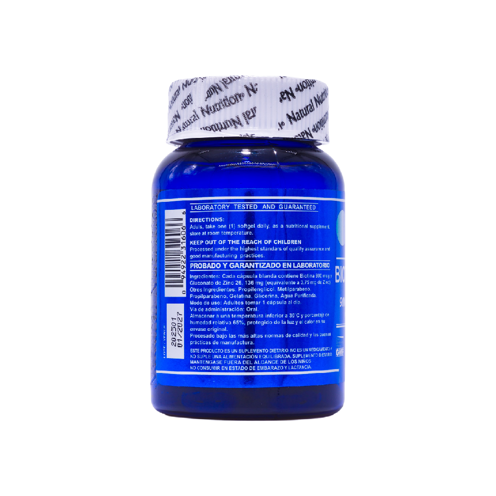 Aporta biotina y zinc, nutrientes que contribuyen al mantenimiento normal de la piel, el cabello y las uñas BIOTINA + ZINC de NATURAL NUTRITION.