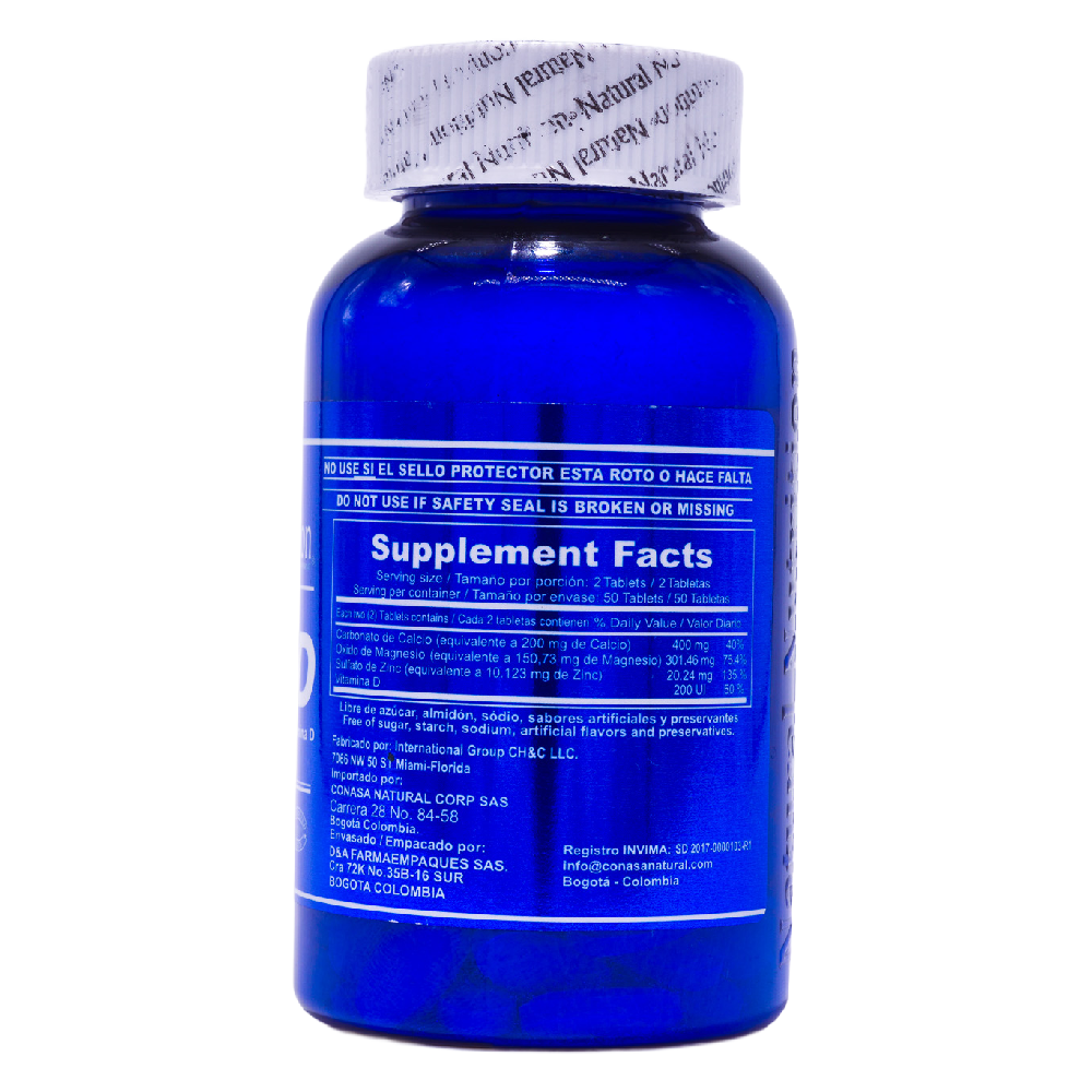 Calcio, magnesio y zinc con vitamina D: una combinación de nutrientes esenciales que contribuyen al mantenimiento de huesos y al funcionamiento normal del sistema inmunológico, acompañando tu bienestar día a día.